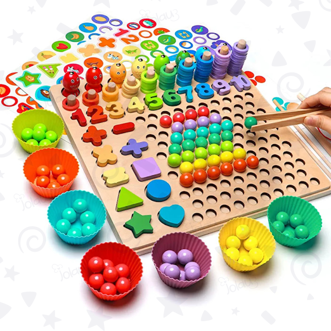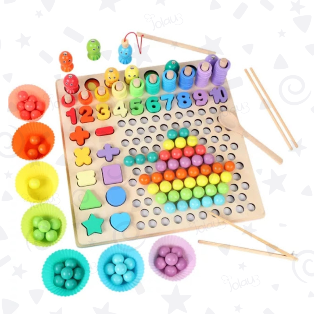 Contiene base, capacillos de silicona, pinza, cuchara, pesca, patrones, numeros, abaco, peces, formas y bolitas