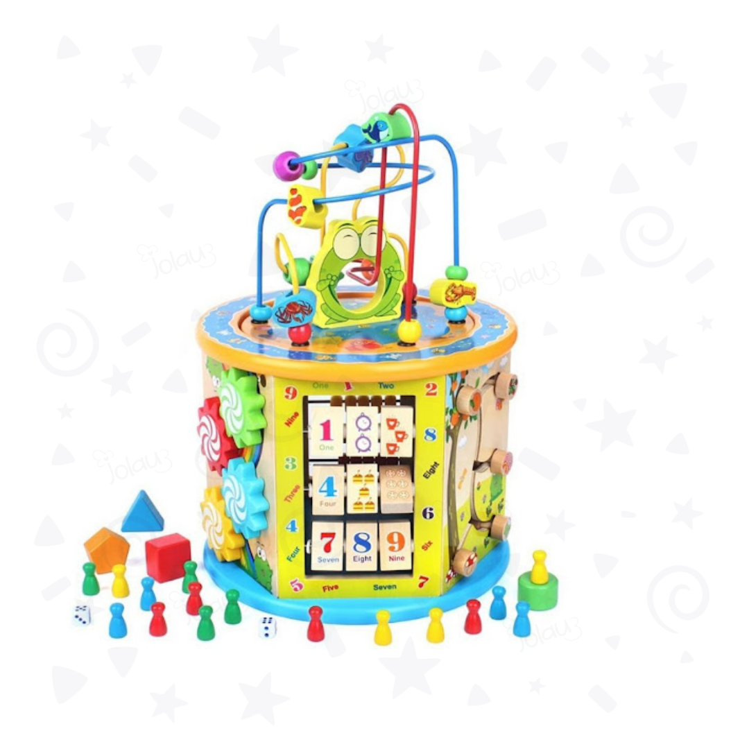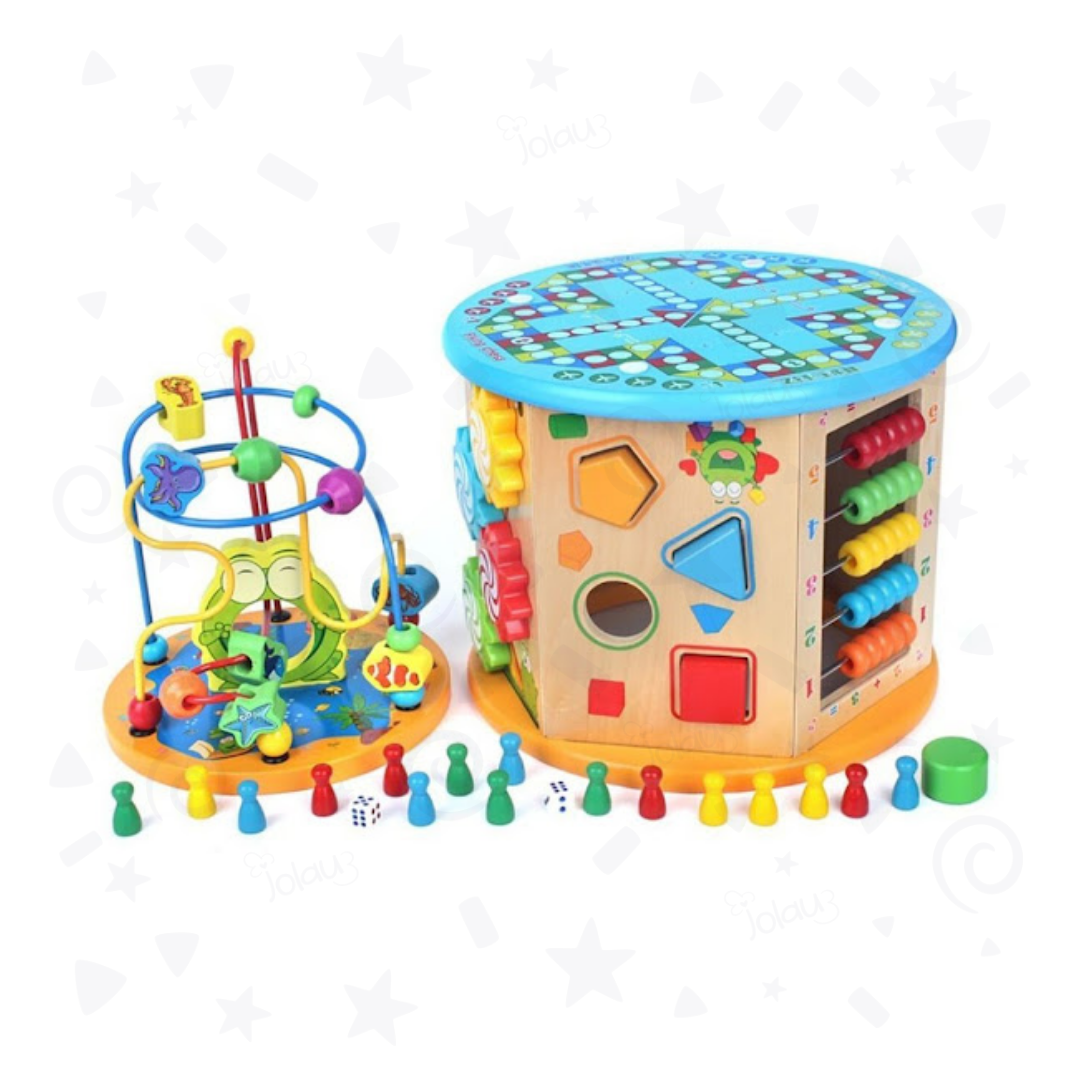 Contiene: laberinto, encajable, engranaje, busca-caminos, ábaco, reloj, placas giratorias y juego de mesa