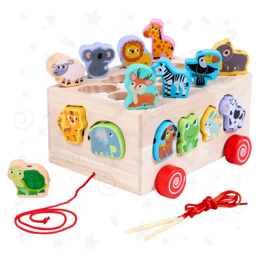 Contiene base encajable, animales para encaje y enhebrado, cuerdas para enhebrado