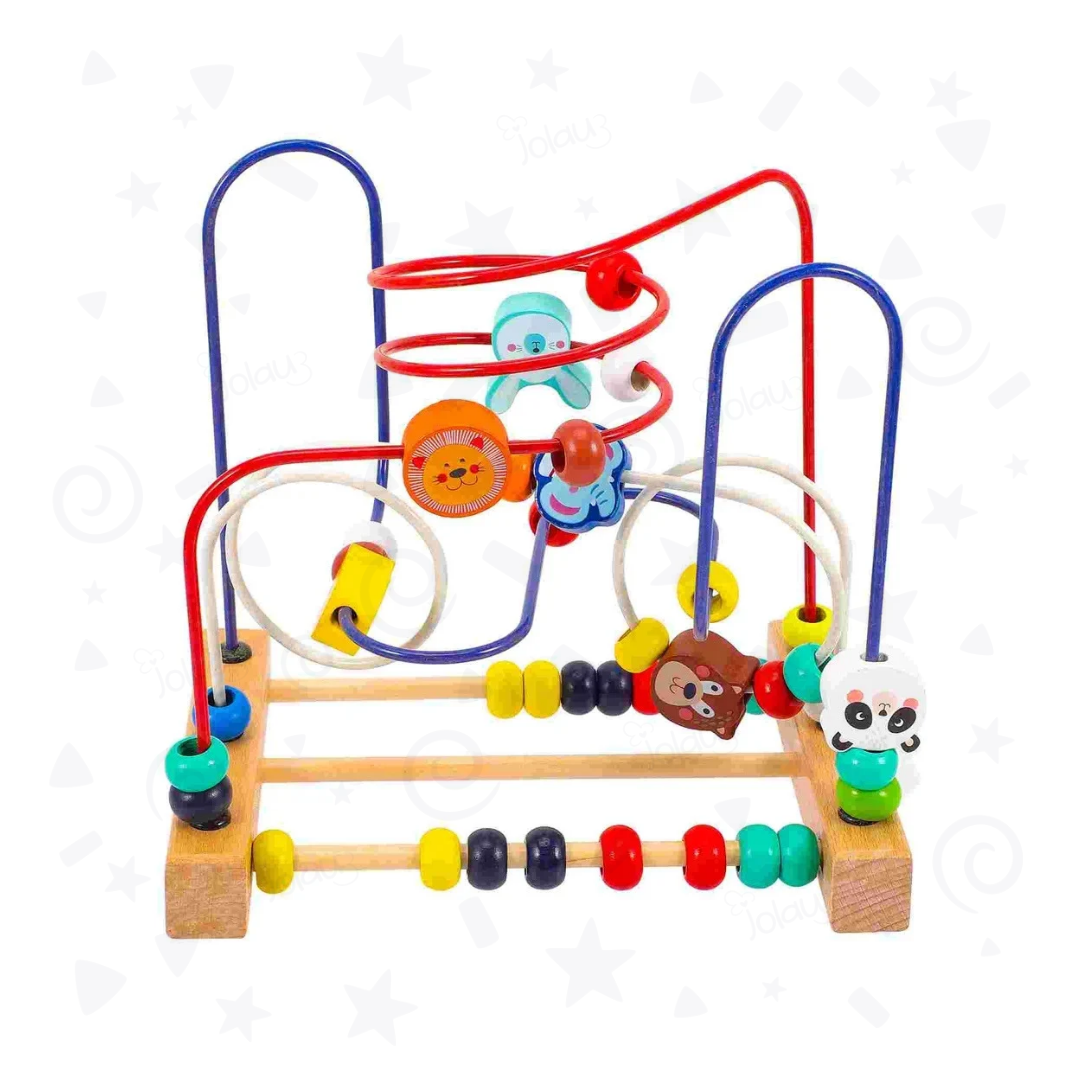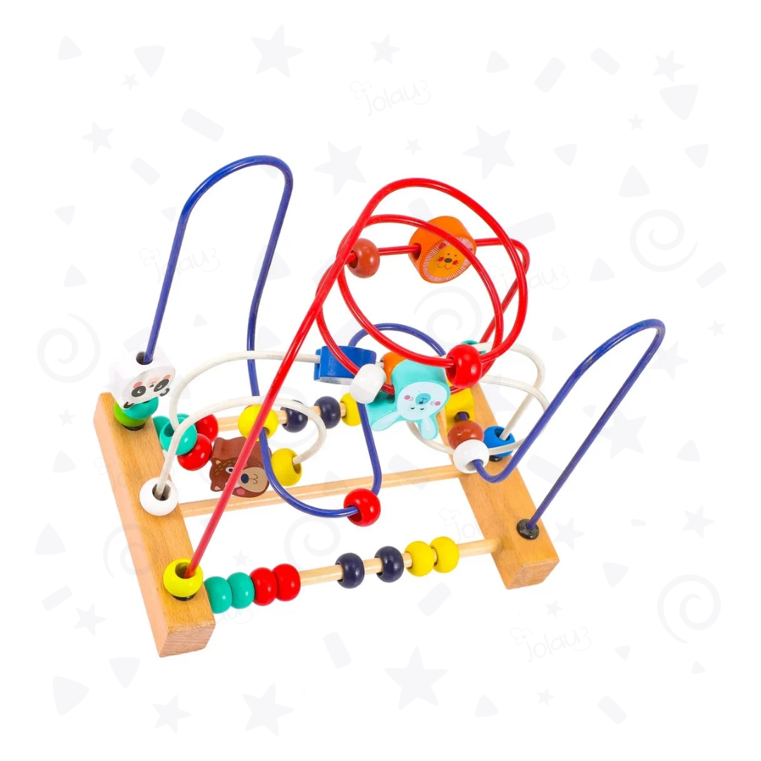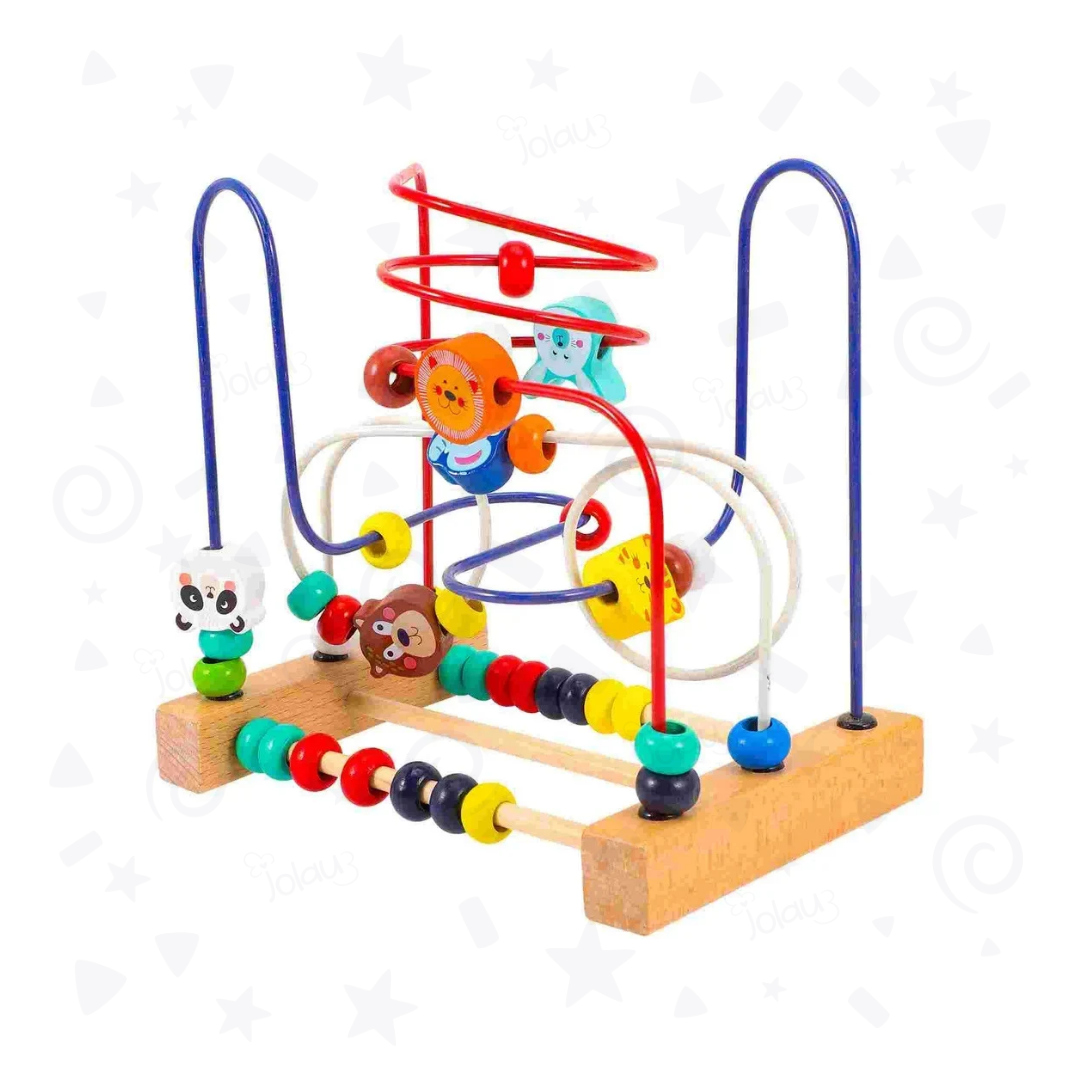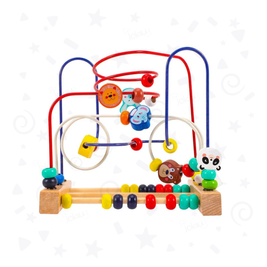 Circuito de motricidad de 3 caminos, con bolas de diferentes colores y piezas de madera con animales.