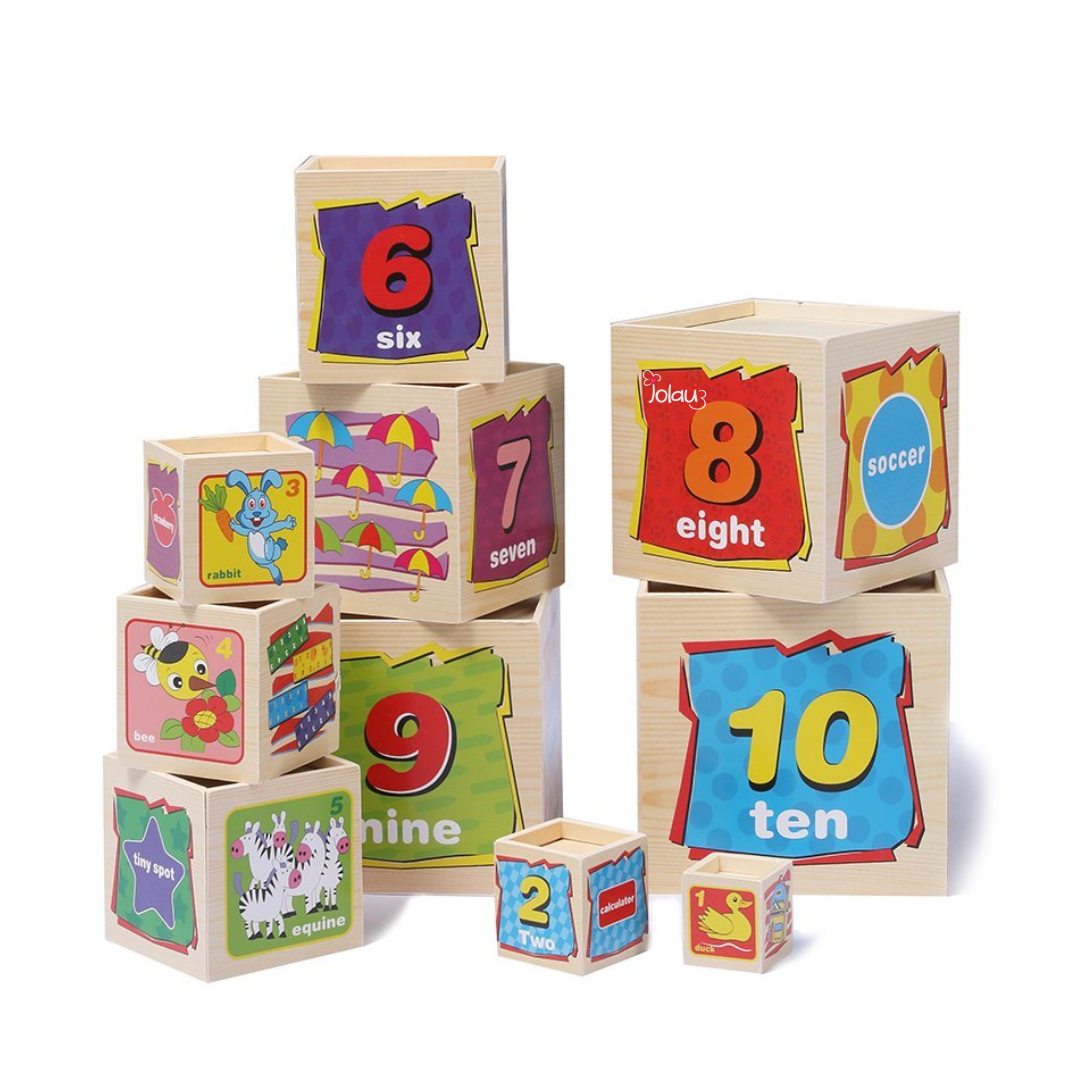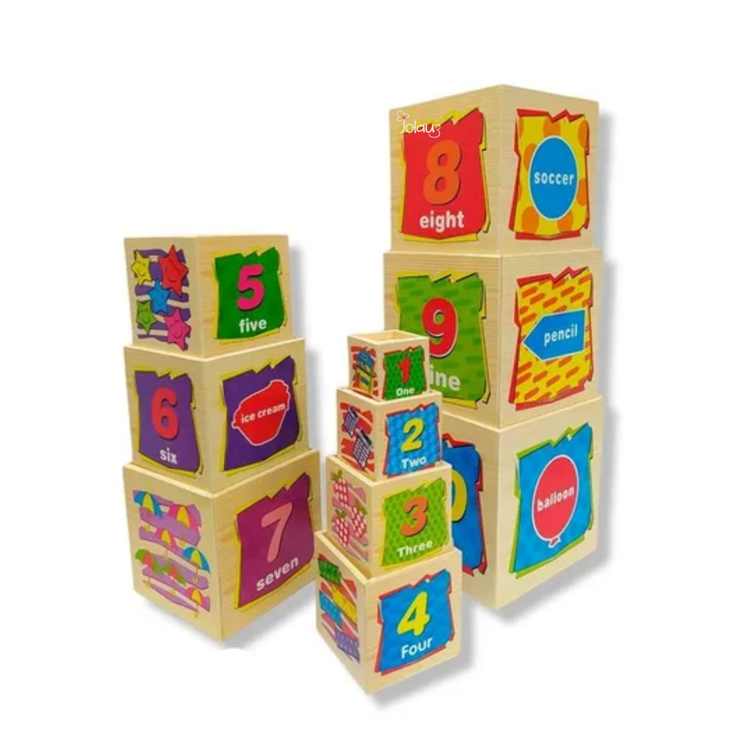 El nene podrá apilarlos uno encima del otro o encajarlos introduciendo las 9 piezas más pequeñas en el cubo más grande.