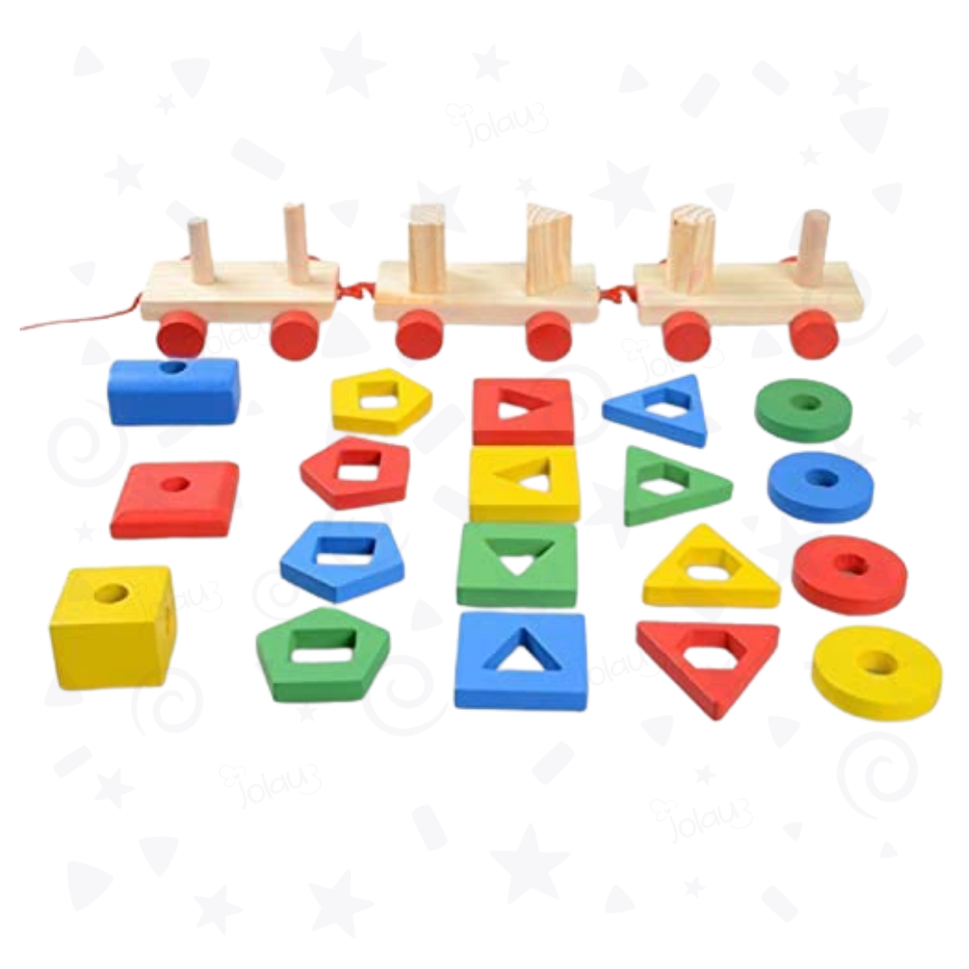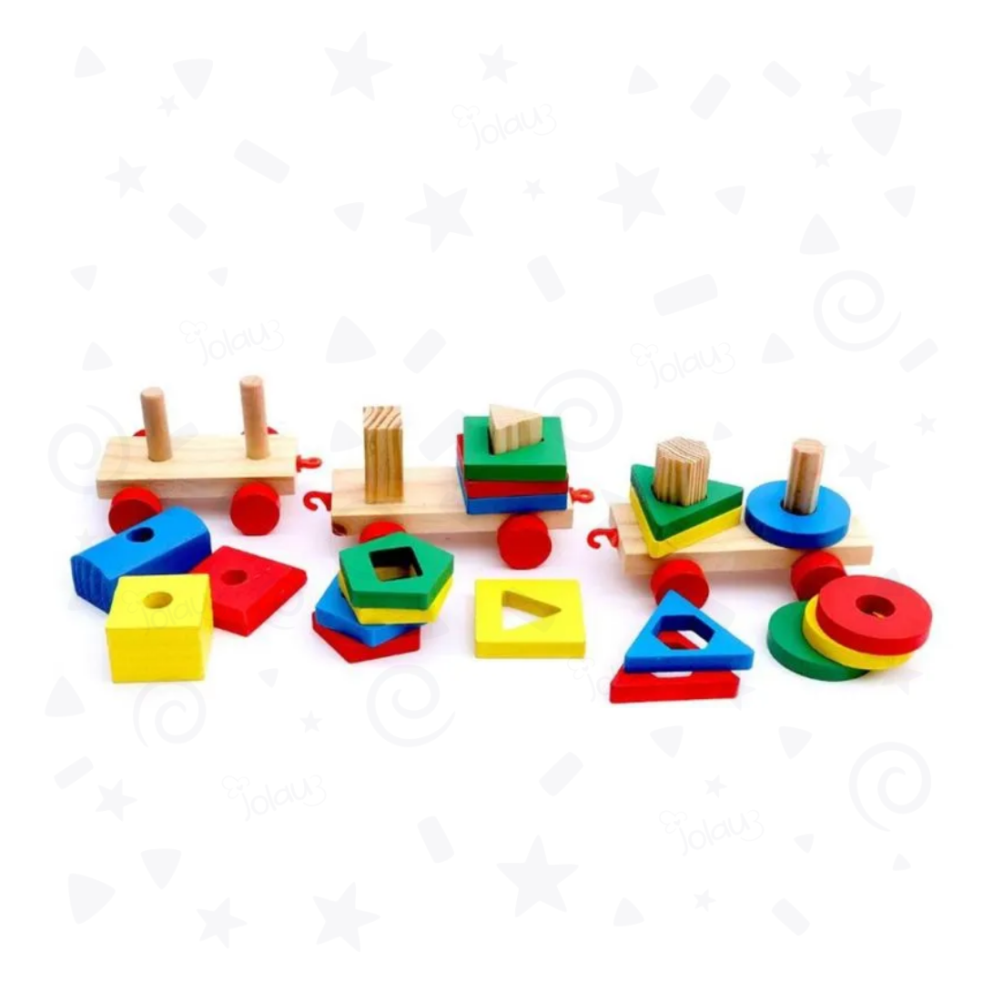 Contiene 1 locomotora y 2 vagones y bloques geométricos para encajar